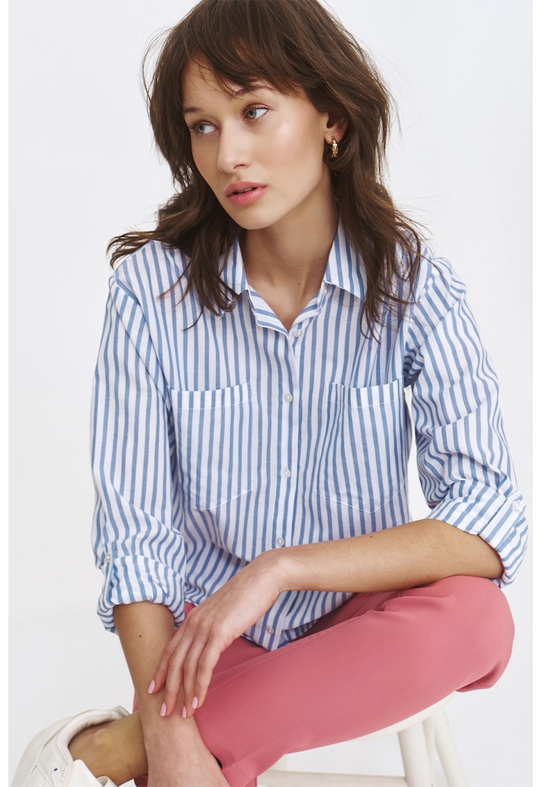 - alb optic Imprimeu: dungi Stil: elegant Material: bumbac Croiala: regular fit Tip maneca: mansete cu nasturi Lungime maneca: maneca lunga Buzunare: buzunare pe piept Sistem inchidere: nasturi Compozitie Exterior: 100% bumbac