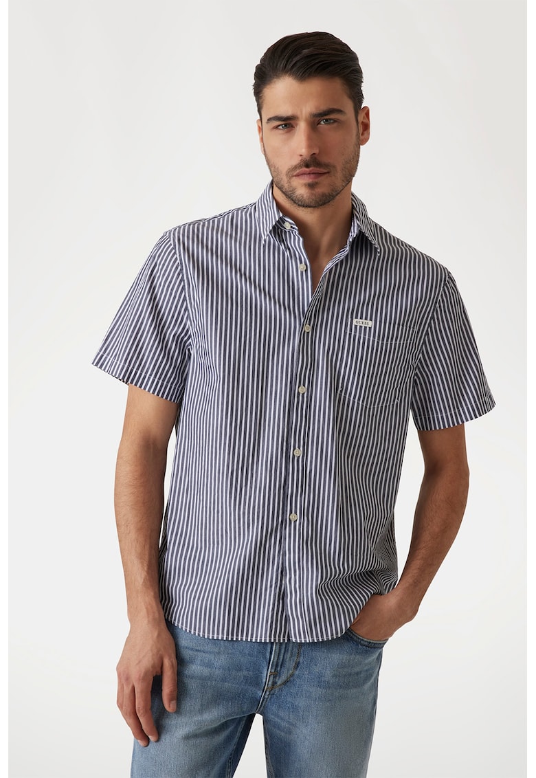 - albastru ultramarin Material: bumbac Imprimeu: dungi Stil: casual Croiala: regular fit Guler: ascutit Lungime maneca: maneca scurta Buzunare: 1 aplicat pe partea din fata Sistem inchidere: nasturi Compozitie Exterior: 100% bumbac