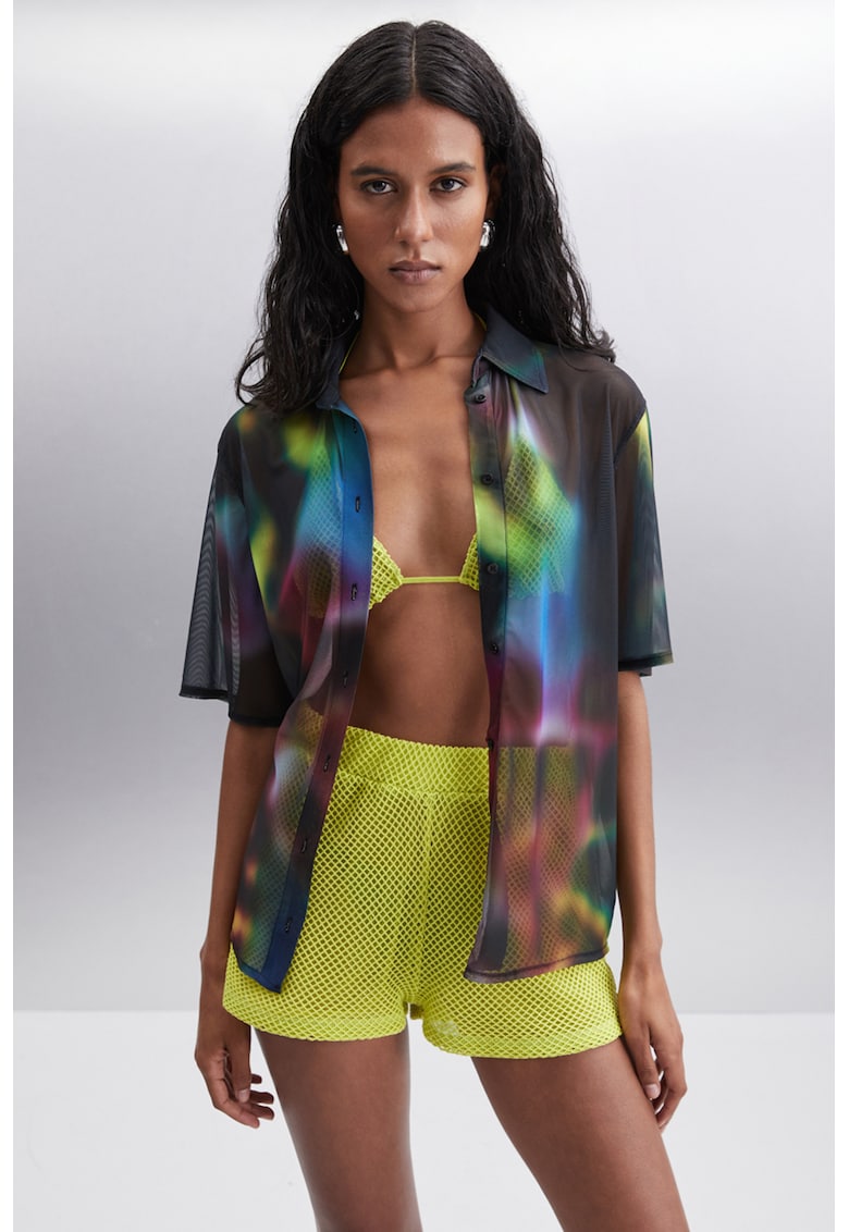 - albastru Imprimeu: abstract Stil: casual Material: poliester Croiala: lejer Guler: ascutit Lungime maneca: maneca medie Detalii: aspect semi transparent Sistem inchidere: nasturi Compozitie Exterior: 100% poliester