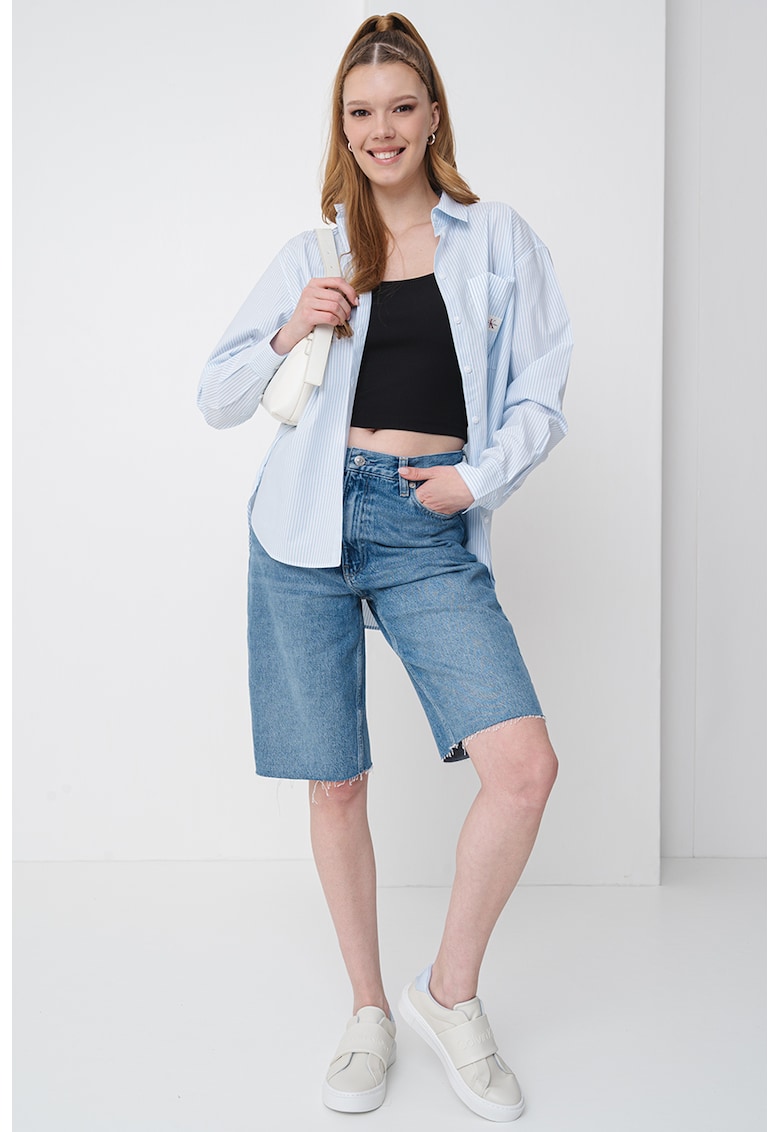 - albastru pastel Imprimeu: dungi Stil: casual Material: bumbac Croiala: lejer Guler: clasic Lungime maneca: maneca lunga Buzunare: 1 buzunar pe piept Sistem inchidere: nasturi Compozitie Exterior: 100% bumbac Info model Modelul poarta un produs de marimea S. Marimi model: 176 cm inaltime