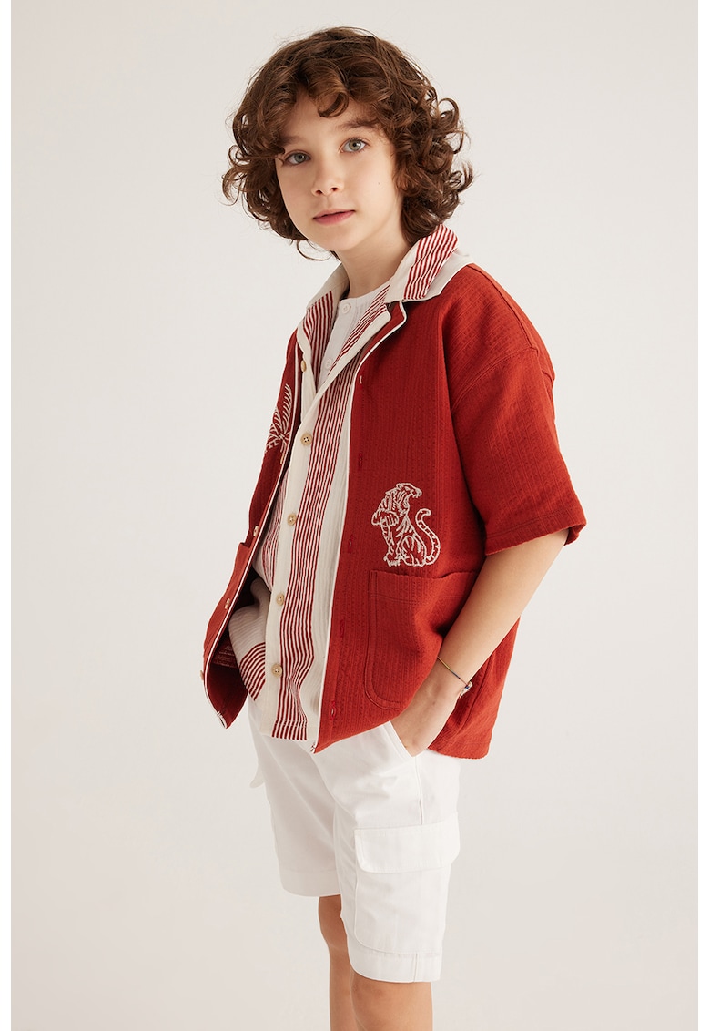 Caracteristici Culoare: portocaliu stins Imprimeu: tropical Material: bumbac Stil: casual Croiala: supradimensionat Guler: clasic Tip maneca: scurta Buzunare: aplicatie frontala Detalii: broderii Colectie: primavara