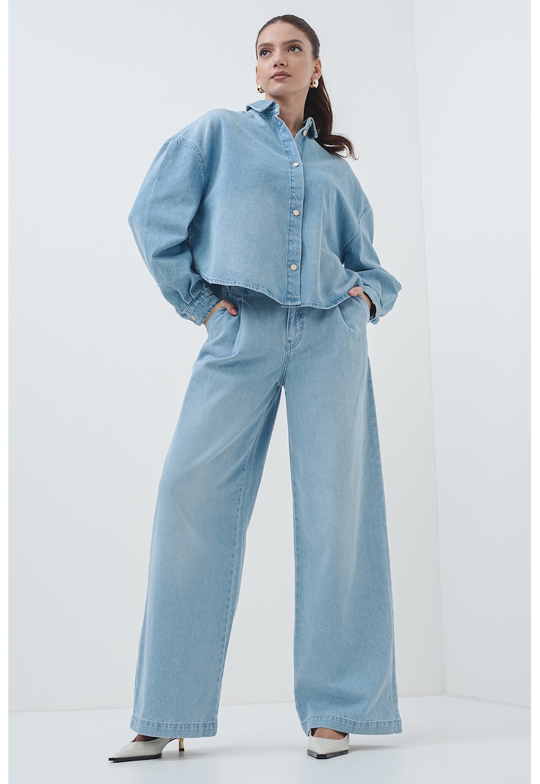 Caracteristici Culoare: albastru deschis melange Imprimeu: uni Stil: casual Material: denim Croiala: lejer Lungime maneca: maneca lunga Sistem inchidere: nasturi Compozitie Exterior: 100% bumbac Info model Modelul poarta un produs de marimea S. Marimi model: 175 cm inaltime