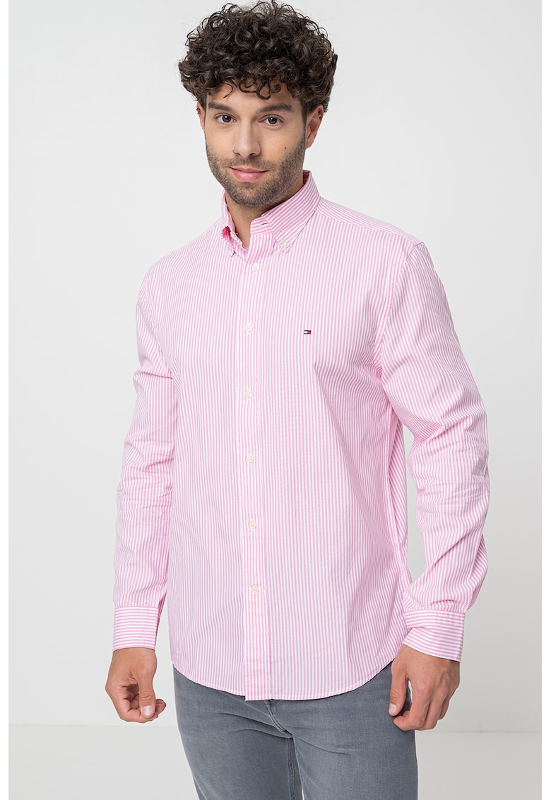 - roz Material: bumbac Imprimeu: dungi Stil: casual Croiala: regular fit Guler: fixat cu nasturi Maneci: cu mansete cu nasturi Lungime maneca: maneca lunga Sistem inchidere: nasturi Compozitie Exterior: 100% bumbac Info model Modelul poarta un produs de marimea M. Marimi model: 179 cm inaltime