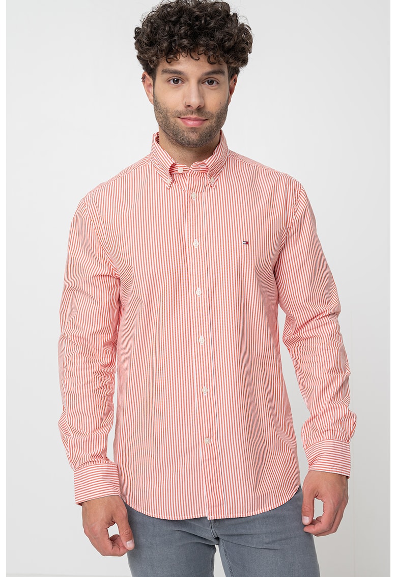 - rosu stins Material: bumbac Imprimeu: dungi Stil: casual Croiala: regular fit Guler: fixat cu nasturi Maneci: cu mansete cu nasturi Lungime maneca: maneca lunga Sistem inchidere: nasturi Compozitie Exterior: 100% bumbac Info model Modelul poarta un produs de marimea M. Marimi model: 179 cm inaltime