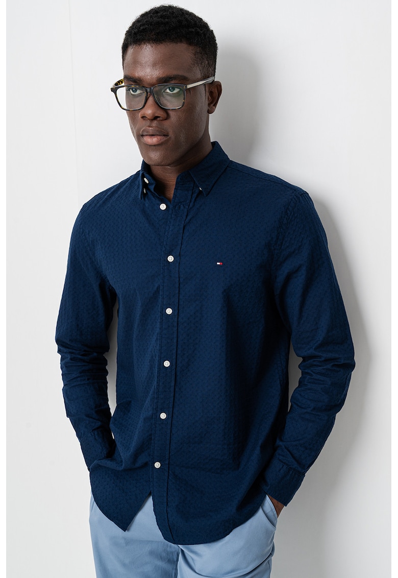 Caracteristici Culoare: bleumarin Material: bumbac Imprimeu: uni Stil: casual Croiala: regular fit Guler: ascutit Lungime maneca: maneca lunga Detalii: aspect texturat Sistem inchidere: nasturi Compozitie Exterior: 100% bumbac Info model Modelul poarta un produs de marimea M. Marimi model: 184 cm inaltime