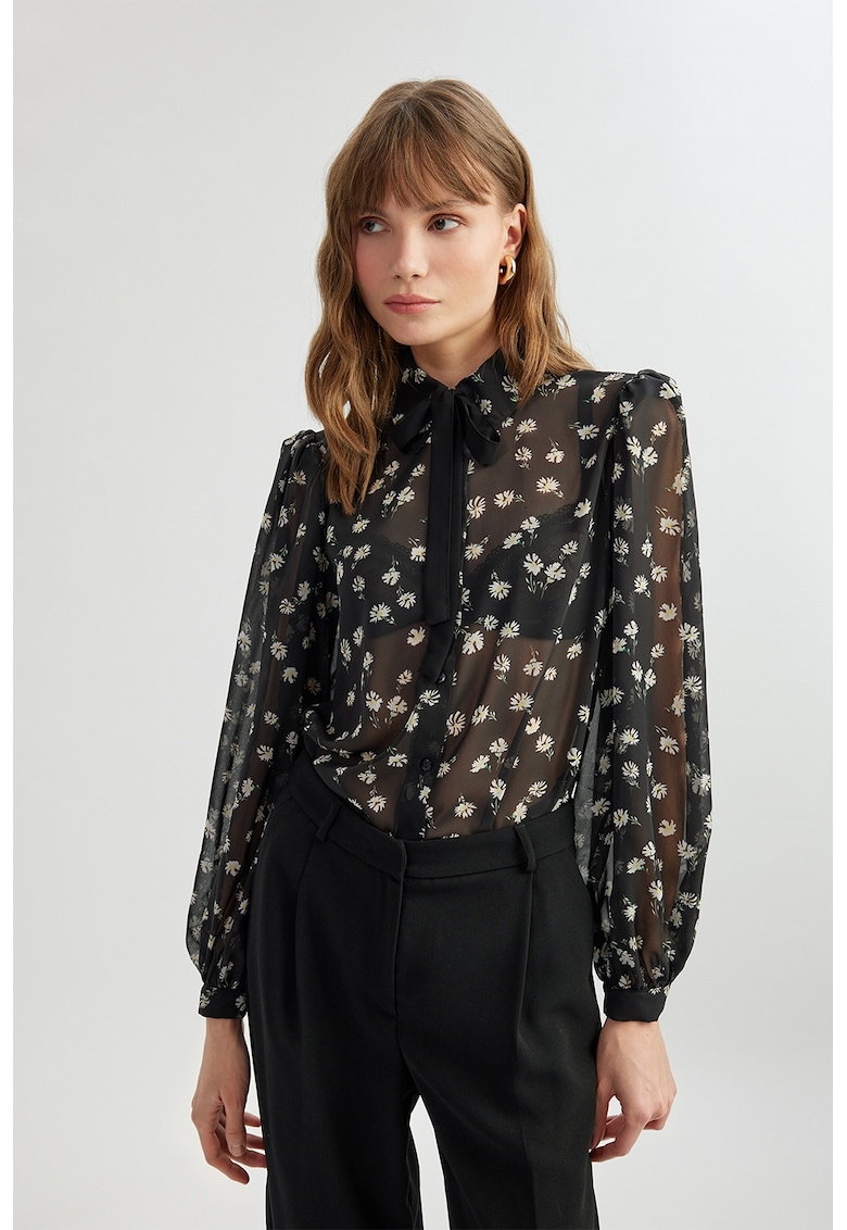 - alb murdar Imprimeu: floral Stil: elegant Material: poliester Croiala: regular fit Guler: ascutit Tip maneca: bufante Lungime maneca: maneca lunga Detalii: aspect semi transparent Sistem inchidere: nasturi Compozitie Exterior: 100% poliester