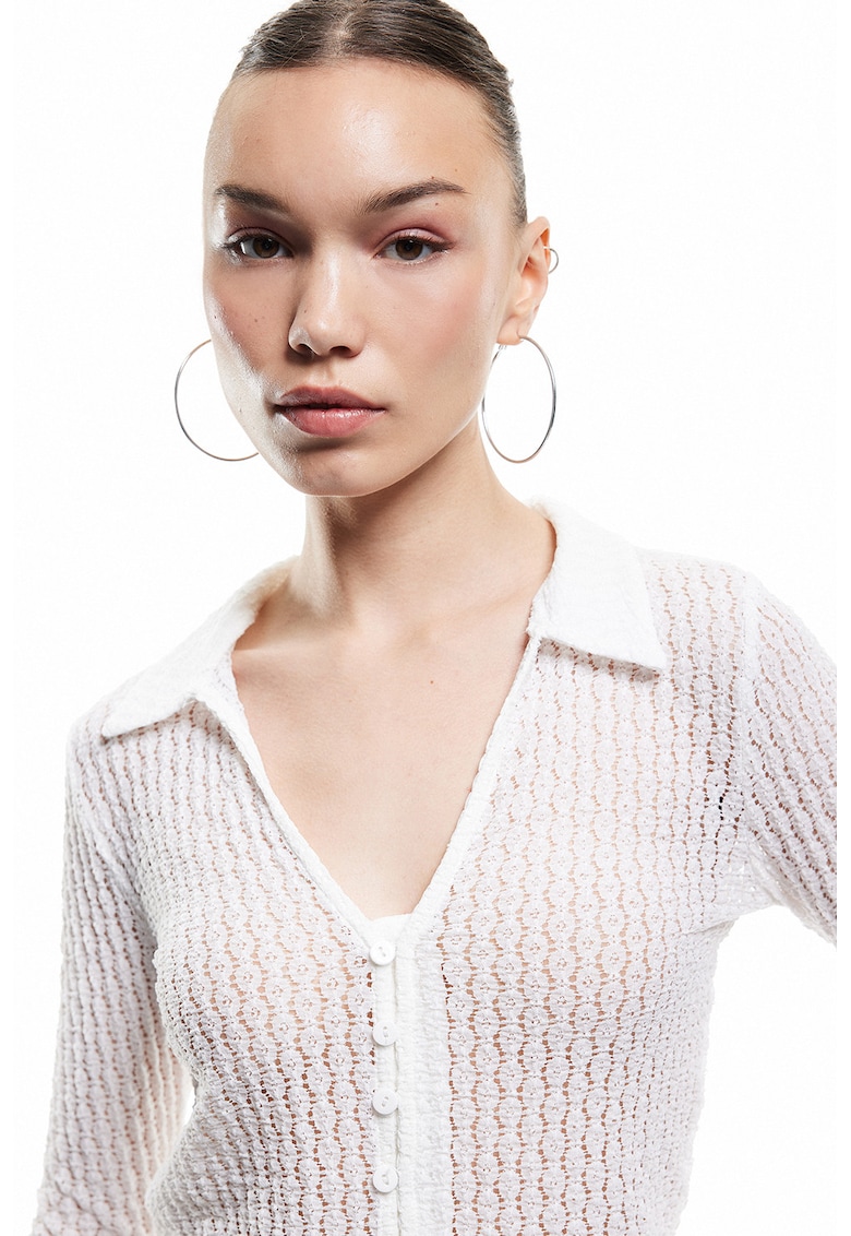- cu decupaj in v Lungime maneca: maneca lunga Detalii: aspect texturat Sistem inchidere: nasturi Compozitie Exterior: 98% poliamida