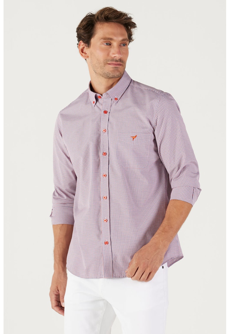 - bumbac Imprimeu: carouri Stil: casual Croiala: slim fit Guler: fixat cu nasturi Maneci: cu mansete cu nasturi Lungime maneca: maneca lunga Buzunare: unul aplicat pe piept Sistem inchidere: nasturi Compozitie Exterior: 55% bumbac