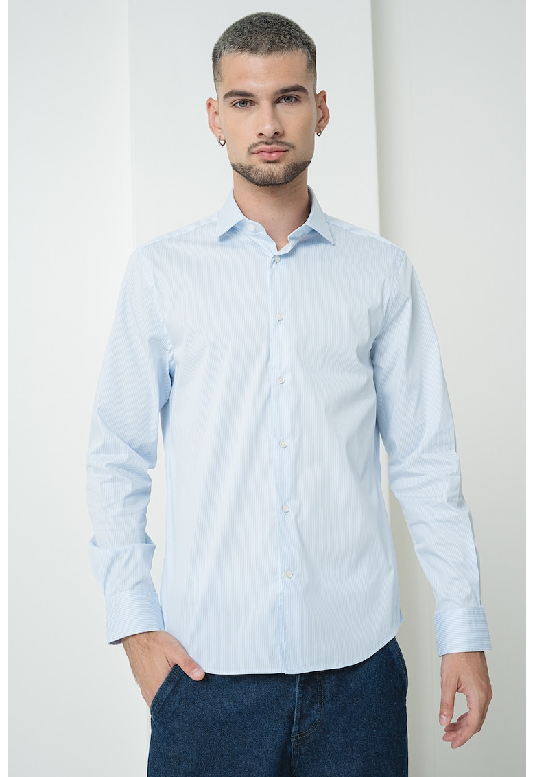 - albastru lavanda Material: bumbac Imprimeu: uni Stil: elegant Croiala: slim fit Guler: fixat cu nasturi Maneci: mansete cu nasturi Lungime maneca: maneca lunga Sistem inchidere: nasturi Compozitie Exterior: 100% bumbac Info model Modelul poarta un produs de marimea M. Marimi model: 190 cm inaltime