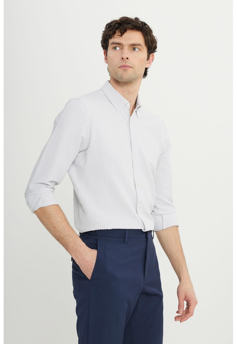 - viscoza Imprimeu: uni Stil: elegant Croiala: slim fit Guler: fixat cu nasturi Maneci: cu mansete cu nasturi Lungime maneca: maneca lunga Sistem inchidere: nasturi Compozitie Exterior: 62% viscoza