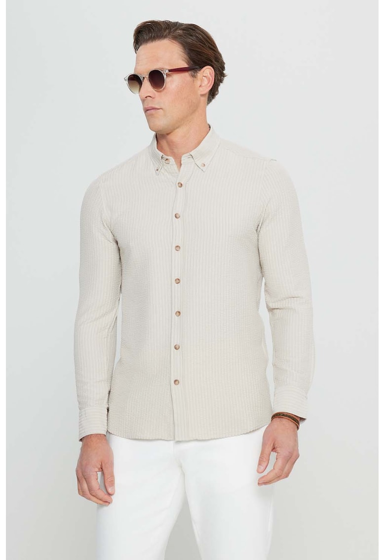 - viscoza Imprimeu: uni Stil: casual Croiala: slim fit Guler: fixat cu nasturi Maneci: cu mansete cu nasturi Lungime maneca: maneca lunga Detalii: aspect texturat Sistem inchidere: nasturi Compozitie Exterior: 62% viscoza
