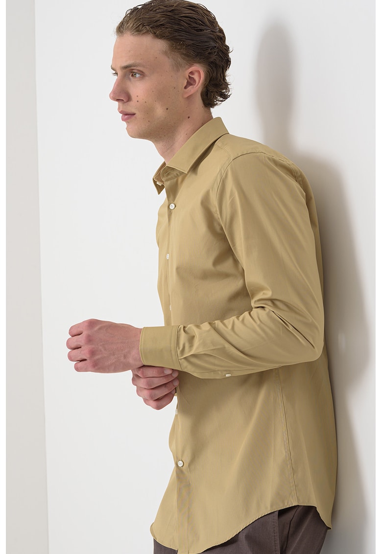 Caracteristici Culoare: camel Material: bumbac Imprimeu: uni Stil: casual Croiala: slim fit Guler: ascutit Lungime maneca: maneca lunga Sistem inchidere: nasturi Compozitie Exterior: 100% bumbac Info model Modelul poarta un produs de marimea 40 EU. Marimi model: 170 cm inaltime