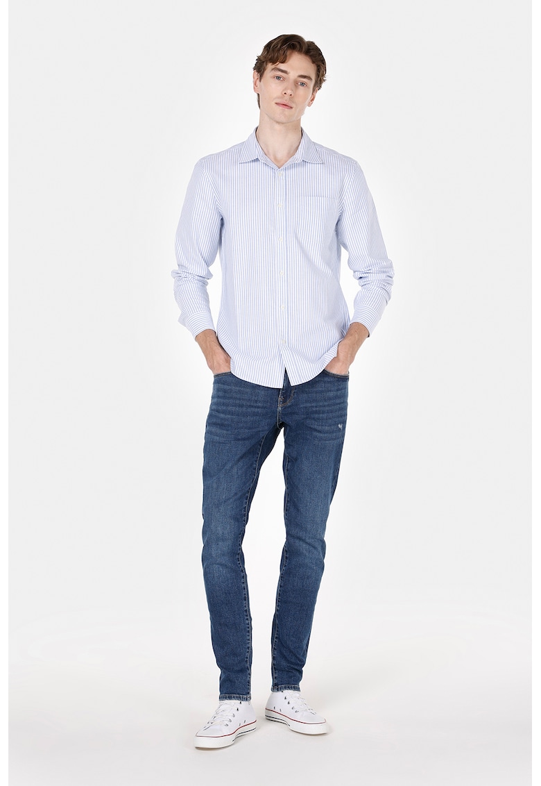 - albastru deschis Material: bumbac Imprimeu: dungi Stil: casual Croiala: slim fit Guler: clasic Maneci: cu mansete cu nasturi Lungime maneca: maneca lunga Buzunare: unul aplicat pe piept Sistem inchidere: nasturi Compozitie Exterior: 100% bumbac