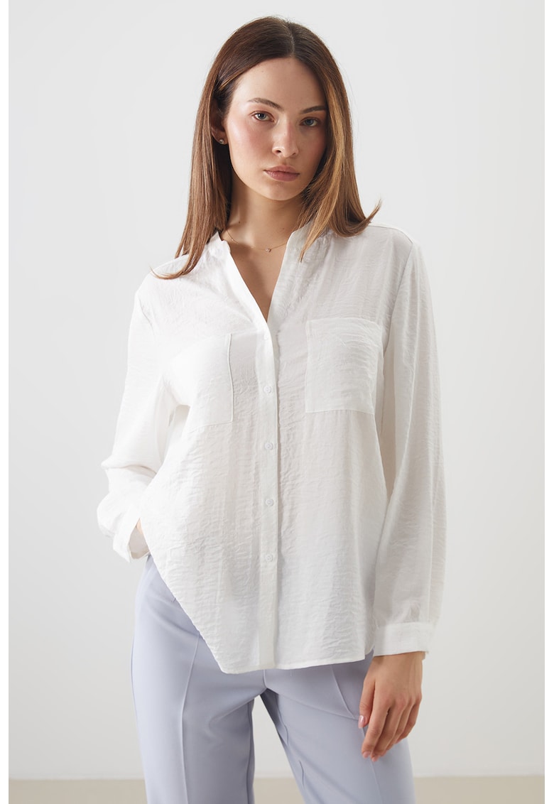 Caracteristici Culoare: alb Imprimeu: uni Stil: casual Material: sintetic Croiala: regular fit Guler: tunica Tip maneca: cu mansete cu nasturi Lungime maneca: maneca lunga Buzunare: aplicate pe piept Sistem inchidere: nasturi Compozitie Exterior: 100% poliester