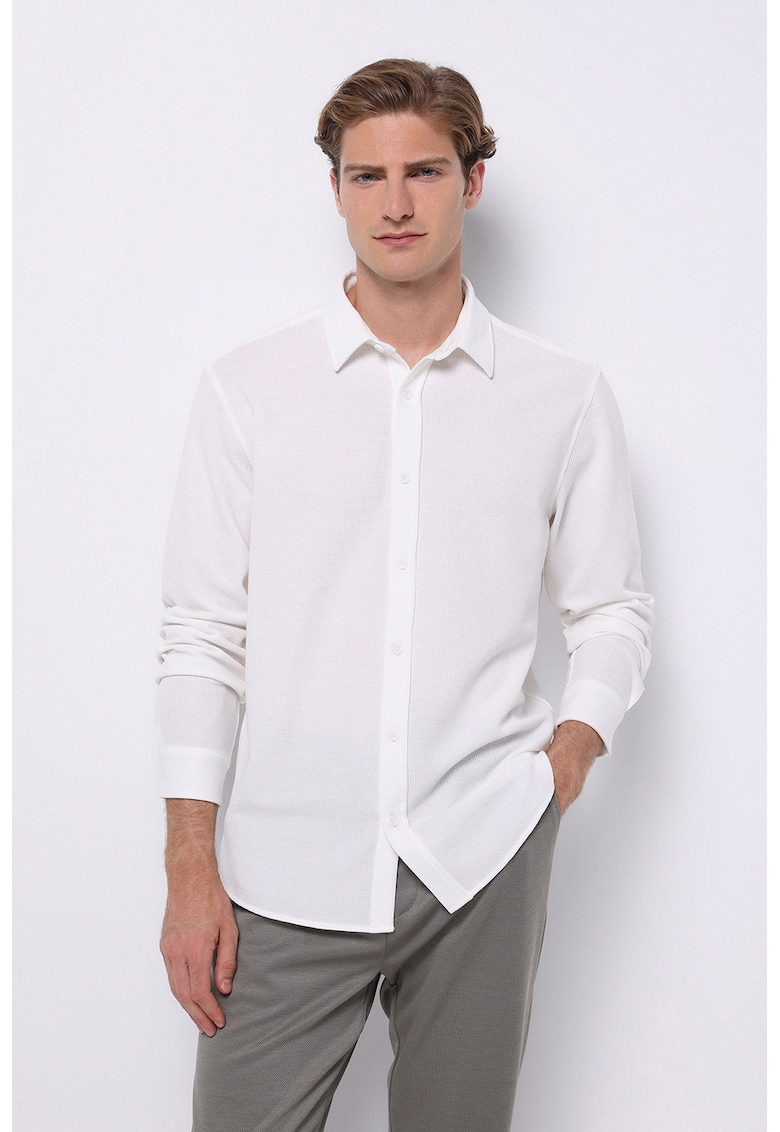 - viscoza Imprimeu: uni Stil: casual Croiala: regular fit Guler: clasic Maneci: cu mansete cu nasturi Lungime maneca: maneca lunga Detalii: aspect texturat Sistem inchidere: nasturi Compozitie Exterior: 78% poliester