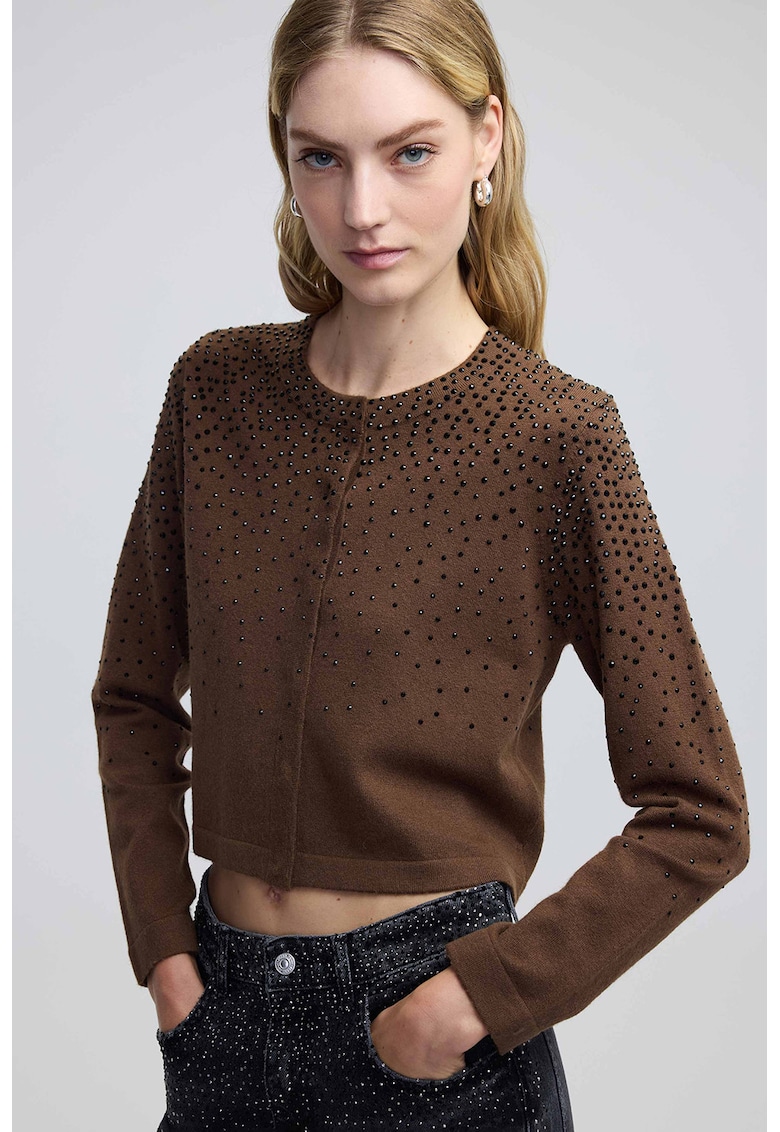 - viscoza Model: rotund Croiala: crop Sistem inchidere: nasturi Decolteu: rotund Lungime maneca: maneca lunga Compozitie Exterior: 52% poliester