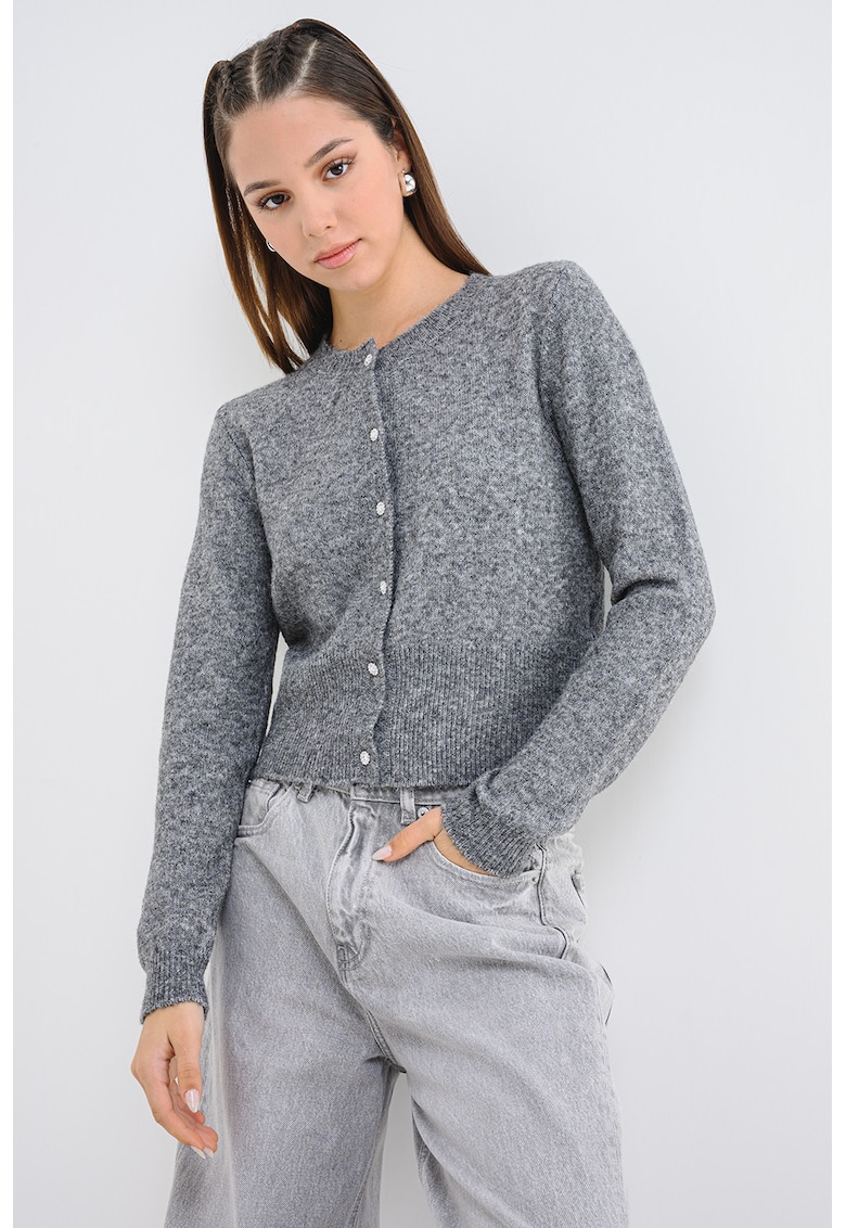 Caracteristici Tip produs: cardigan Culoare: gri inchis melange Imprimeu: uni Material: poliester