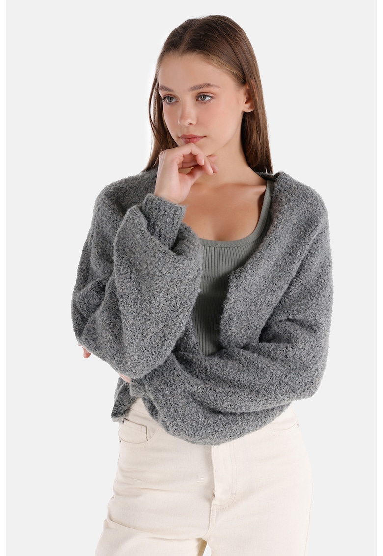 Caracteristici Tip produs: cardigan Culoare: gri inchis melange Imprimeu: uni Material: poliester