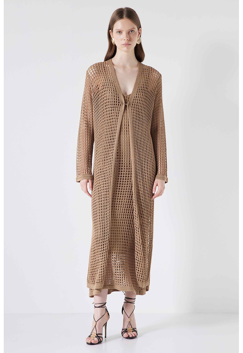 Caracteristici Tip produs: cardigan Culoare: maro deschis Imprimeu: uni Material: viscoza Model: in v Croiala: regular fit Sistem inchidere: fara inchidere Decolteu: in v Lungime maneca: maneca lunga Detalii: model cu perforatii Compozitie Exterior: 89% viscoza