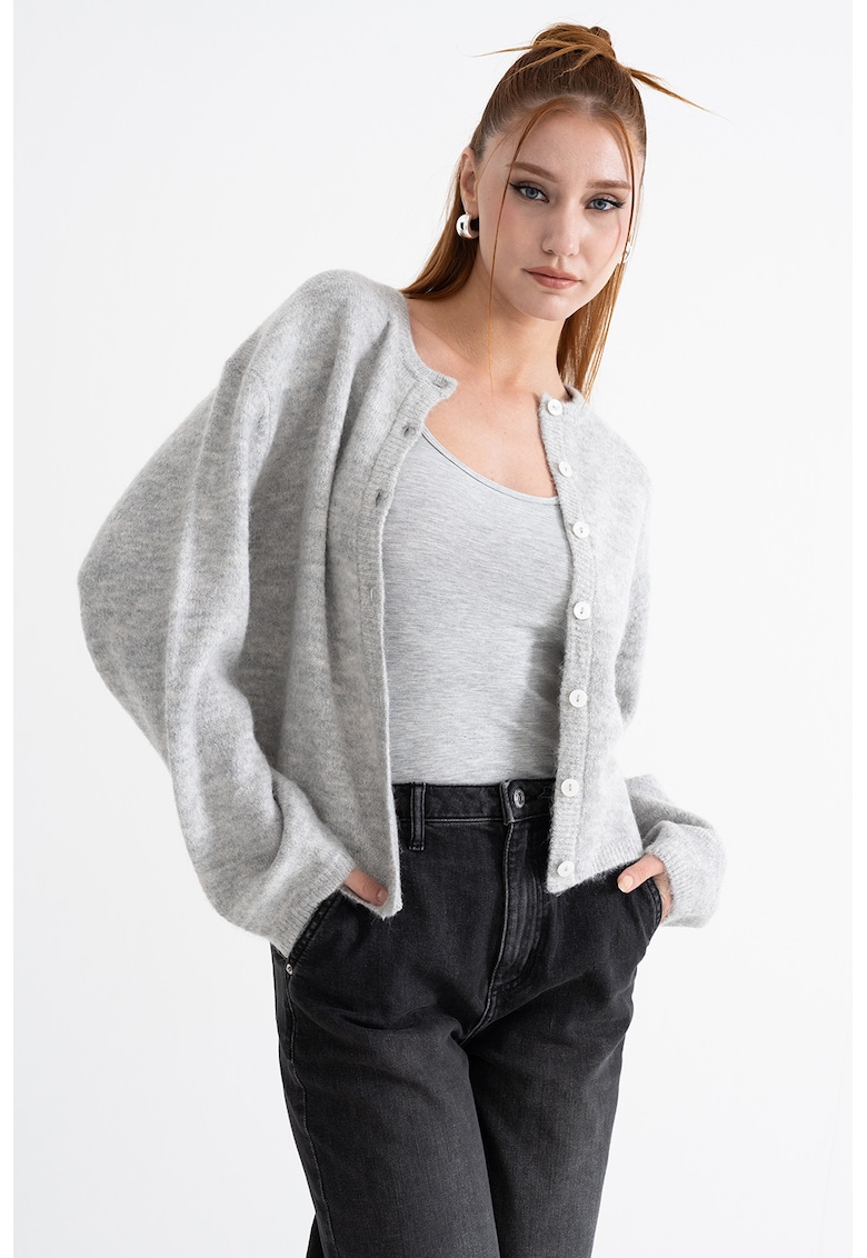 Caracteristici Tip produs: cardigan Culoare: gri deschis melange Imprimeu: uni Material: lana