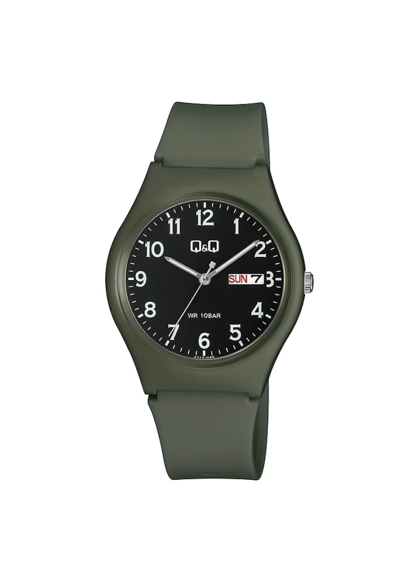 Caracteristici Mecanism: quartz Rezistenta la apa: 10 atm Stil: casual Afisaj: analogic Carcasa: rotunda Culoare carcasa: verde Functii: data Tip citire cadran: cifre arabe Culoare curea/bratara: verde Sistem inchidere: catarama Compozitie Material carcasa: plastic Material curea/bratara: cauciuc Material geam: acrilic Dimensiuni Diametru carcasa: 38 mm Latime curea/bratara: 18 mm