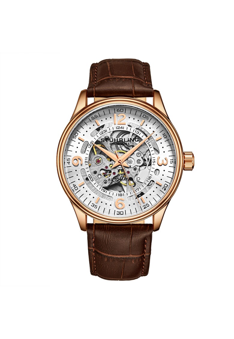 - secunda Rezistenta la apa: 5 atm Cadran Material geam: cristal mineral Tip citire cadran: cifre arabe Carcasa Forma carcasa: rotunda Material carcasa: inox Culoare carcasa: auriu rose Diametru carcasa: 42 mm Curea/bratara Tip: curea Material curea/bratara: piele naturala Culoare curea/bratara: maro