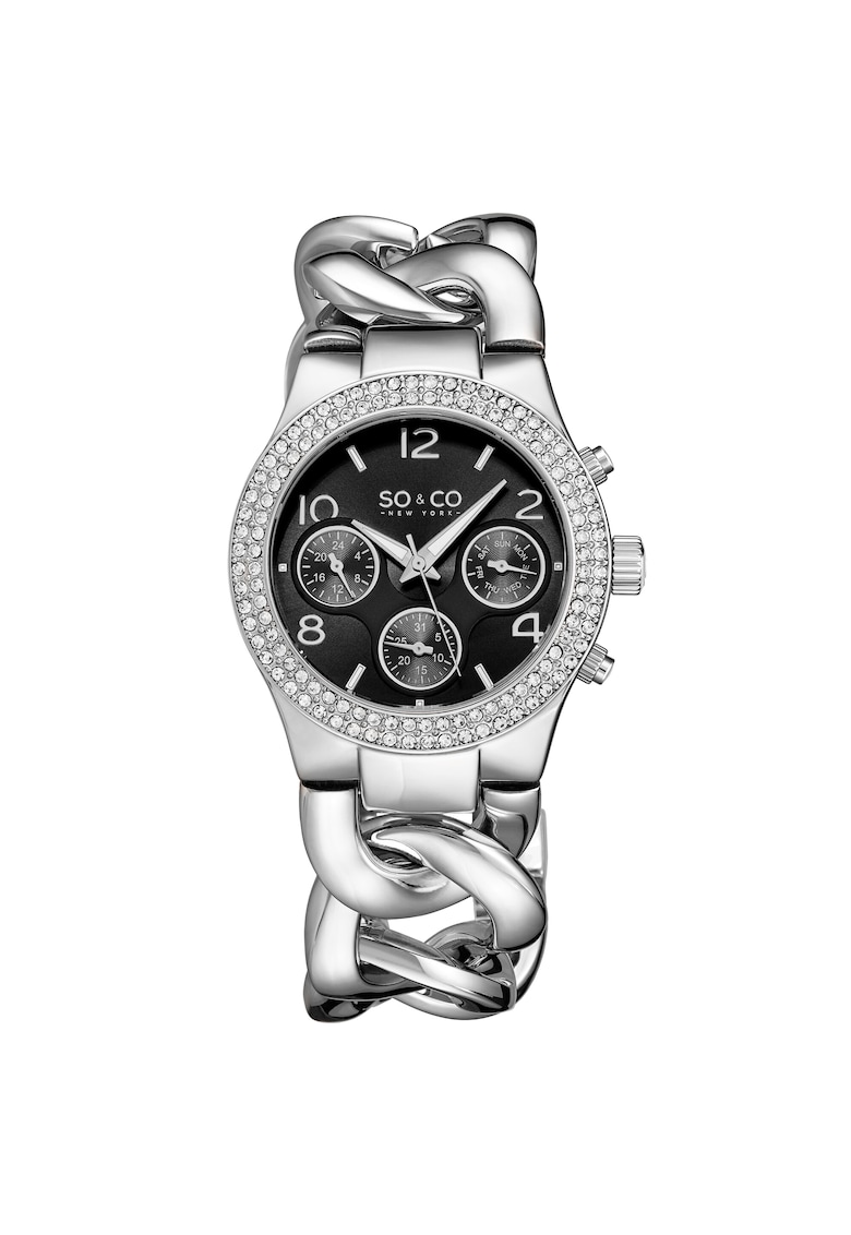 - afisare 24 h Rezistenta la apa: 5 atm Cadran Material geam: cristal mineral Culoare cadran: negru Carcasa Forma carcasa: rotunda Material carcasa: aliaj Culoare carcasa: argintiu Diametru carcasa: 38 mm Curea/bratara Tip: bratara Material curea/bratara: inox Culoare curea/bratara: argintiu