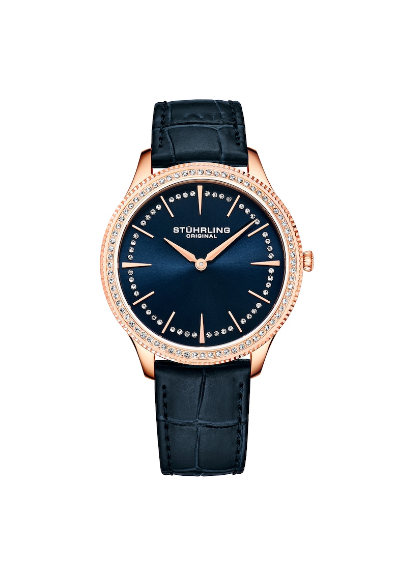 - minut Cadran Material geam: cristal mineral Tip citire cadran: linii Carcasa Forma carcasa: rotunda Material carcasa: inox Culoare carcasa: auriu rose Curea/bratara Tip: curea Material curea/bratara: piele naturala Culoare curea/bratara: bleumarin