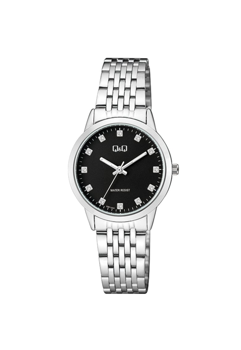 Caracteristici Tip mecanism: quartz Provenienta mecanism: japonia Tip display: analog Stil: elegant Functii: ora Rezistenta la apa: 3 atm Cadran Material geam: cristal mineral Culoare cadran: negru Tip citire cadran: puncte Carcasa Forma carcasa: rotunda Material carcasa: metal Culoare carcasa: argintiu Diametru carcasa: 32 mm Curea/bratara Tip: bratara Material curea/bratara: metal Culoare curea/bratara: argintiu