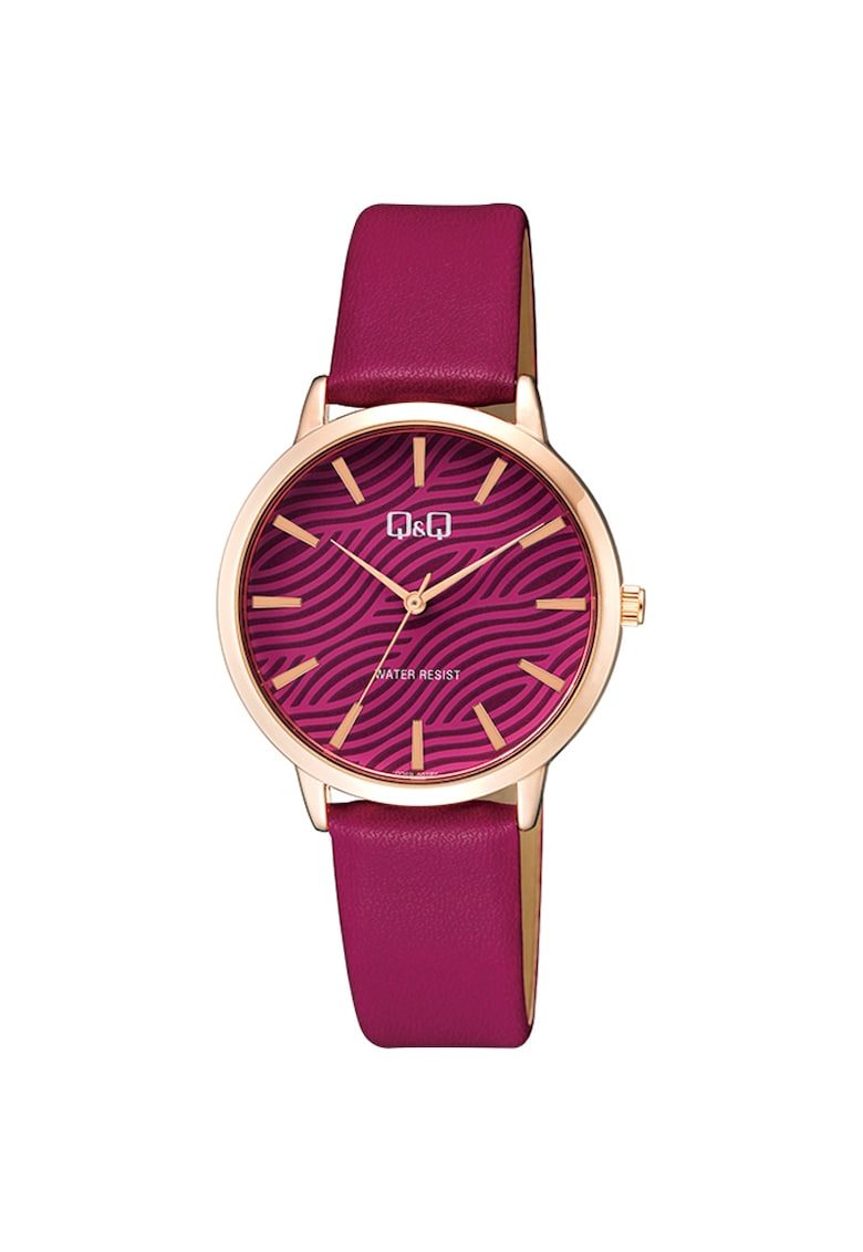 Caracteristici Tip mecanism: quartz Provenienta mecanism: japonia Tip display: analog Stil: casual Functii: ora Rezistenta la apa: 3 atm Cadran Material geam: cristal mineral Tip citire cadran: linii Carcasa Forma carcasa: rotunda Material carcasa: metal Culoare carcasa: aur roz Curea/bratara Tip: curea Material curea/bratara: piele ecologica Culoare curea/bratara: rosu