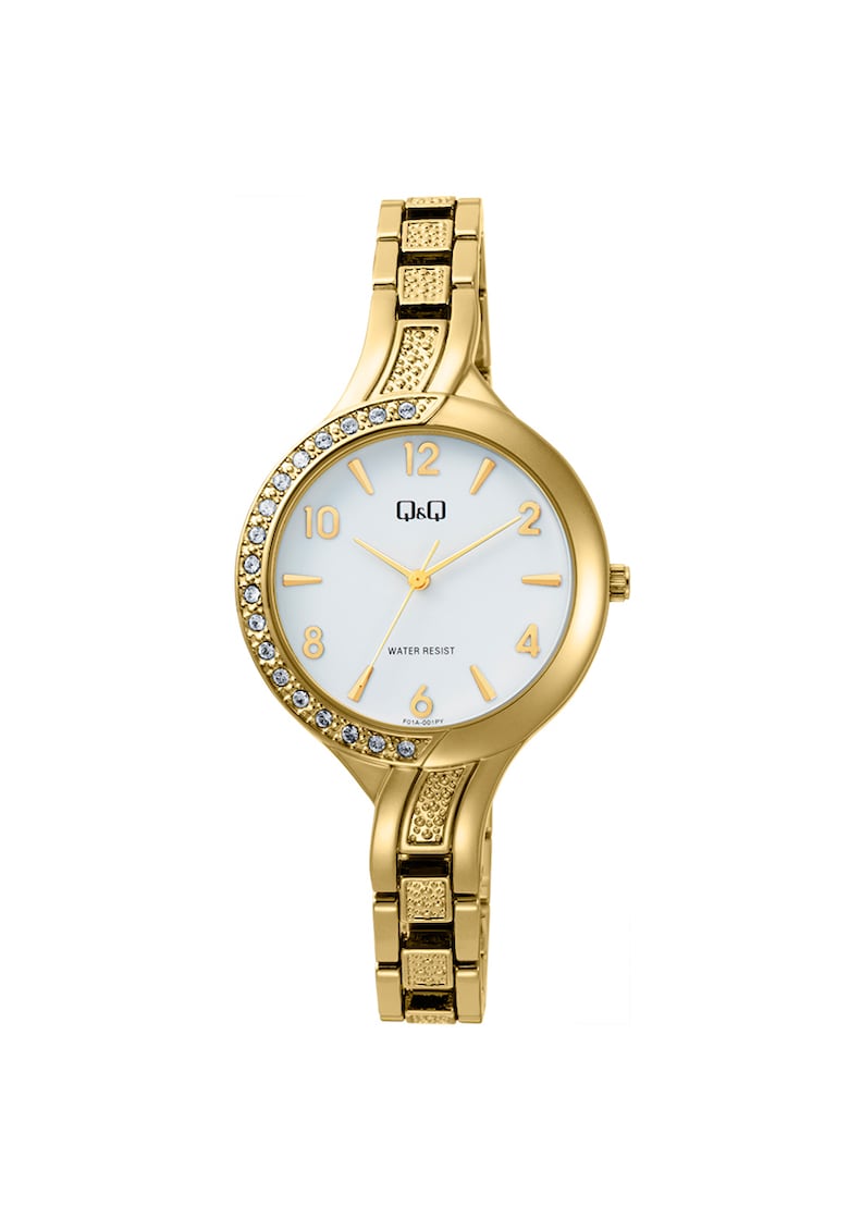 Caracteristici Tip mecanism: quartz Provenienta mecanism: japonia Tip display: analog Stil: elegant Functii: ora Rezistenta la apa: 3 atm Cadran Material geam: cristal mineral Tip citire cadran: cifre arabe Carcasa Forma carcasa: rotunda Material carcasa: metal Culoare carcasa: auriu Curea/bratara Tip: bratara Material curea/bratara: metal Culoare curea/bratara: auriu