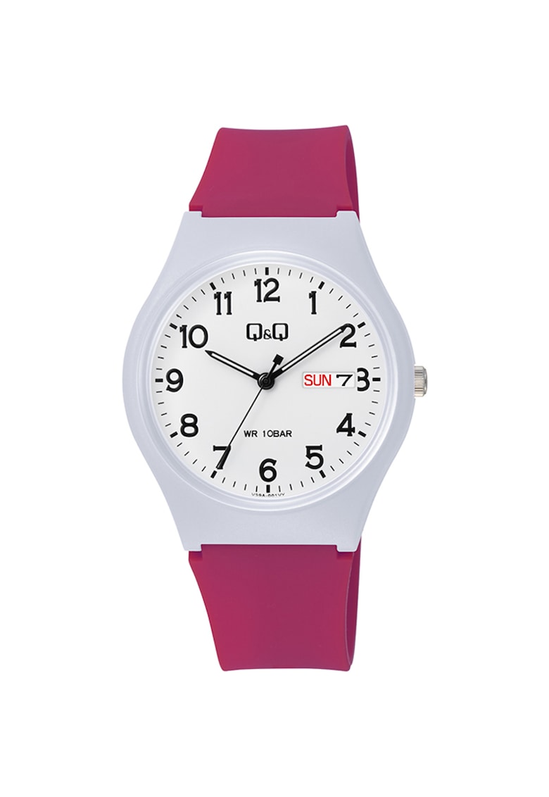 Caracteristici Tip mecanism: quartz Provenienta mecanism: japonia Tip display: analog Stil: casual Functii: ziua saptamanii Rezistenta la apa: 10 atm Cadran Material geam: plastic Tip citire cadran: cifre arabe Carcasa Forma carcasa: rotunda Material carcasa: plastic Curea/bratara Tip: curea Material curea/bratara: poliuretan Culoare curea/bratara: roz