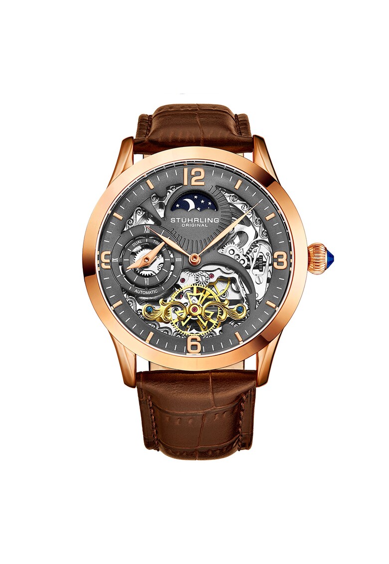 - dual time Rezistenta la apa: 5 atm Cadran Material geam: cristal mineral Culoare cadran: gri Carcasa Forma carcasa: rotunda Material carcasa: inox Culoare carcasa: auriu rose Diametru carcasa: 44 mm Curea/bratara Tip: curea Material curea/bratara: piele naturala Culoare curea/bratara: maro