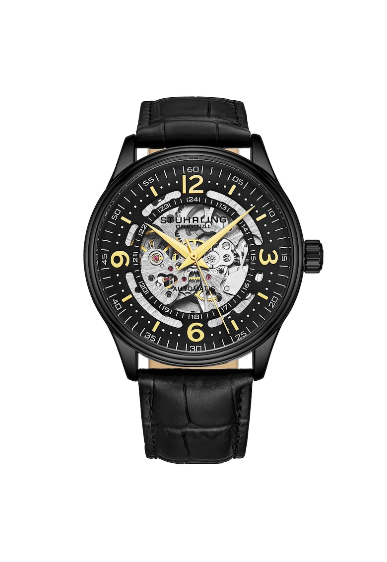 - secunda Rezistenta la apa: 5 atm Cadran Material geam: cristal mineral Tip citire cadran: cifre arabe Carcasa Forma carcasa: rotunda Material carcasa: inox Culoare carcasa: negru Curea/bratara Tip: curea Material curea/bratara: piele naturala Culoare curea/bratara: negru