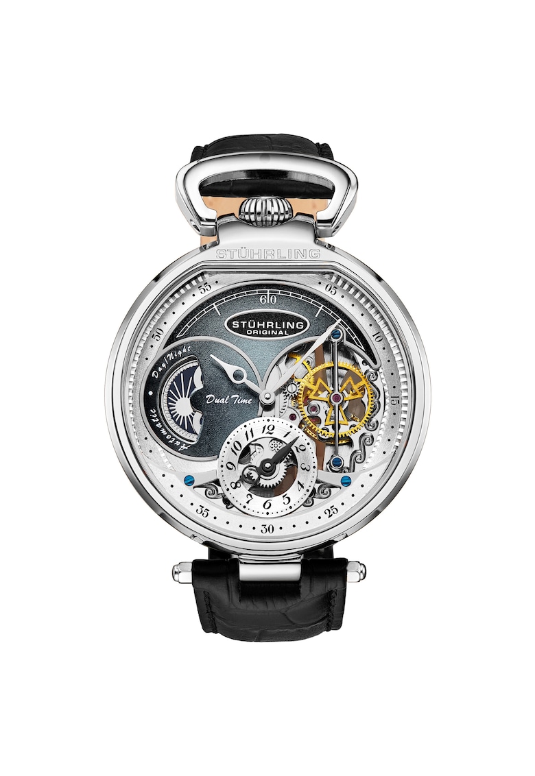 - dual time Rezistenta la apa: 5 atm Cadran Material geam: cristal mineral Carcasa Forma carcasa: rotunda Material carcasa: aliaj Culoare carcasa: argintiu Diametru carcasa: 46 mm Curea/bratara Tip: curea Material curea/bratara: piele naturala Culoare curea/bratara: negru Latime curea/bratara: 22 mm