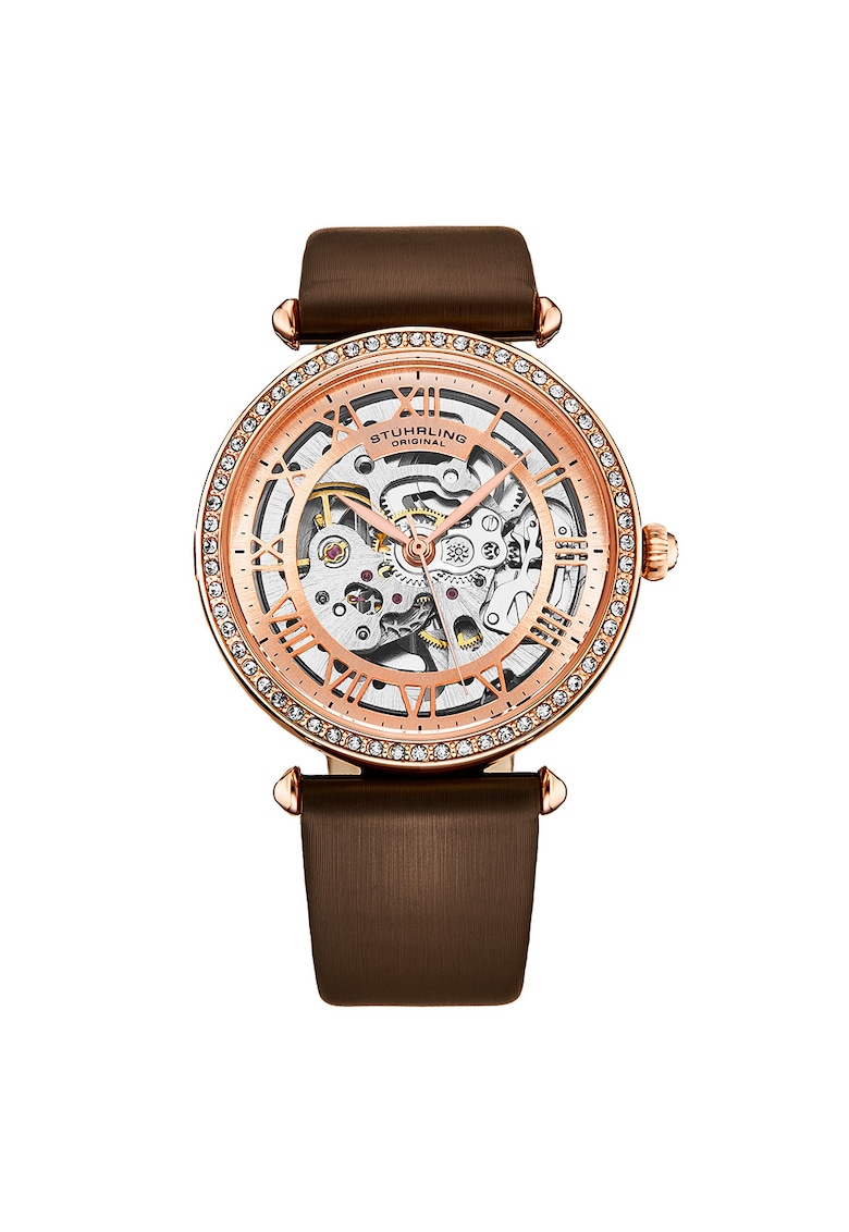 - cristale pe coroana Cadran Material geam: cristal mineral Culoare cadran: auriu rose Carcasa Forma carcasa: rotunda Material carcasa: aliaj Culoare carcasa: auriu rose Diametru carcasa: 38 mm Curea/bratara Tip: curea Material curea/bratara: piele naturala Culoare curea/bratara: maro
