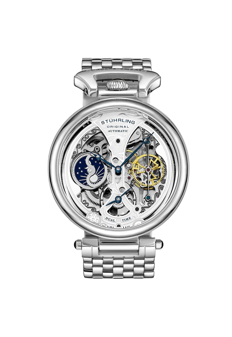 - dual time Rezistenta la apa: 5 atm Detalii: cadran skeleton Cadran Material geam: cristal mineral Tip citire cadran: fara indici Carcasa Forma carcasa: rotunda Material carcasa: inox Culoare carcasa: argintiu Curea/bratara Tip: bratara Material curea/bratara: inox Culoare curea/bratara: argintiu