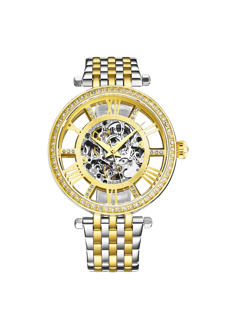 - mecanism vizibil Cadran Material geam: cristal mineral Culoare cadran: auriu Carcasa Forma carcasa: rotunda Material carcasa: aliaj Culoare carcasa: auriu Diametru carcasa: 38 mm Curea/bratara Tip: bratara Material curea/bratara: inox Culoare curea/bratara: argintiu