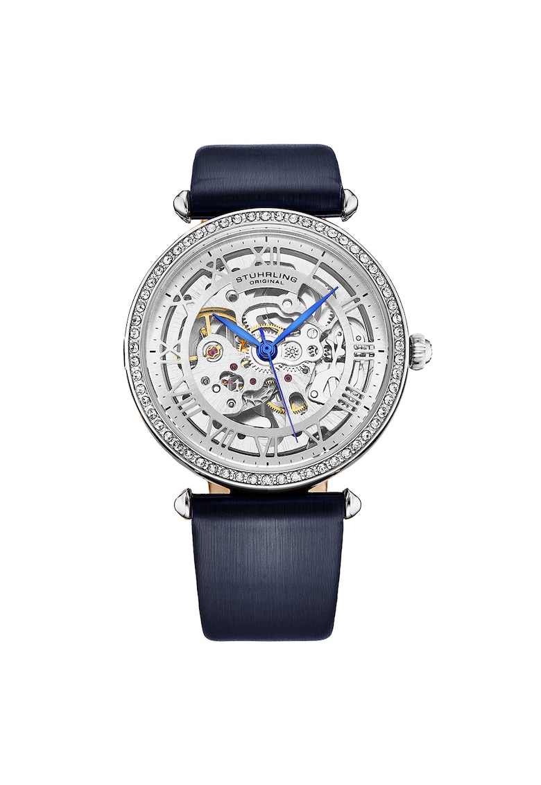 - cristale pe coroana Cadran Material geam: cristal mineral Culoare cadran: argintiu Carcasa Forma carcasa: rotunda Material carcasa: aliaj Culoare carcasa: argintiu Diametru carcasa: 38 mm Curea/bratara Tip: curea Material curea/bratara: piele naturala Culoare curea/bratara: bleumarin