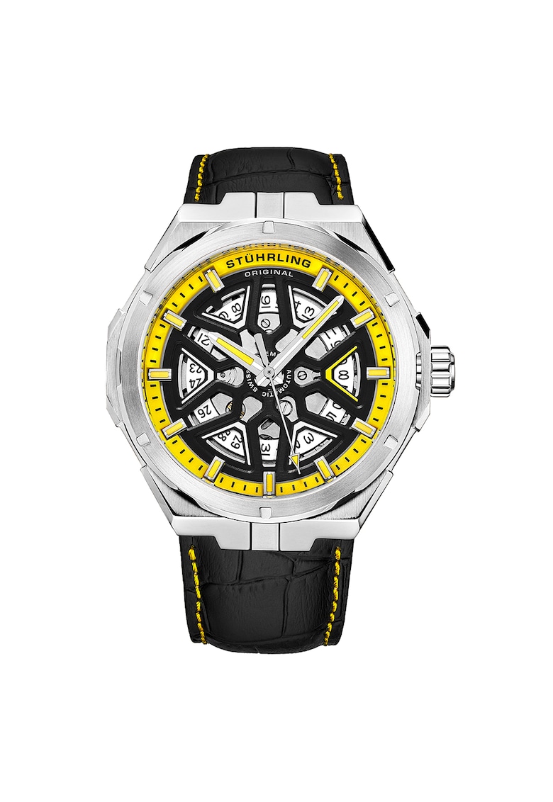 - afisare data Rezistenta la apa: 5 atm Detalii: limbi si indecsi luminosi Cadran Material geam: cristal mineral Carcasa Forma carcasa: rotunda Material carcasa: inox Culoare carcasa: argintiu Diametru carcasa: 41 mm Curea/bratara Tip: curea Material curea/bratara: piele naturala Culoare curea/bratara: negru
