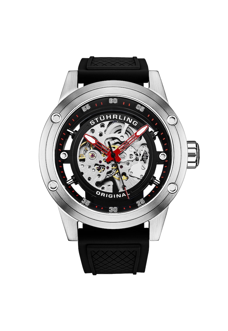 - secunda Rezistenta la apa: 5 atm Detalii: mecanism vizibil Cadran Material geam: cristal mineral Tip citire cadran: cifre arabe Carcasa Forma carcasa: rotunda Material carcasa: aliaj Culoare carcasa: argintiu Diametru carcasa: 50 mm Curea/bratara Tip: curea Material curea/bratara: silicon Culoare curea/bratara: negru
