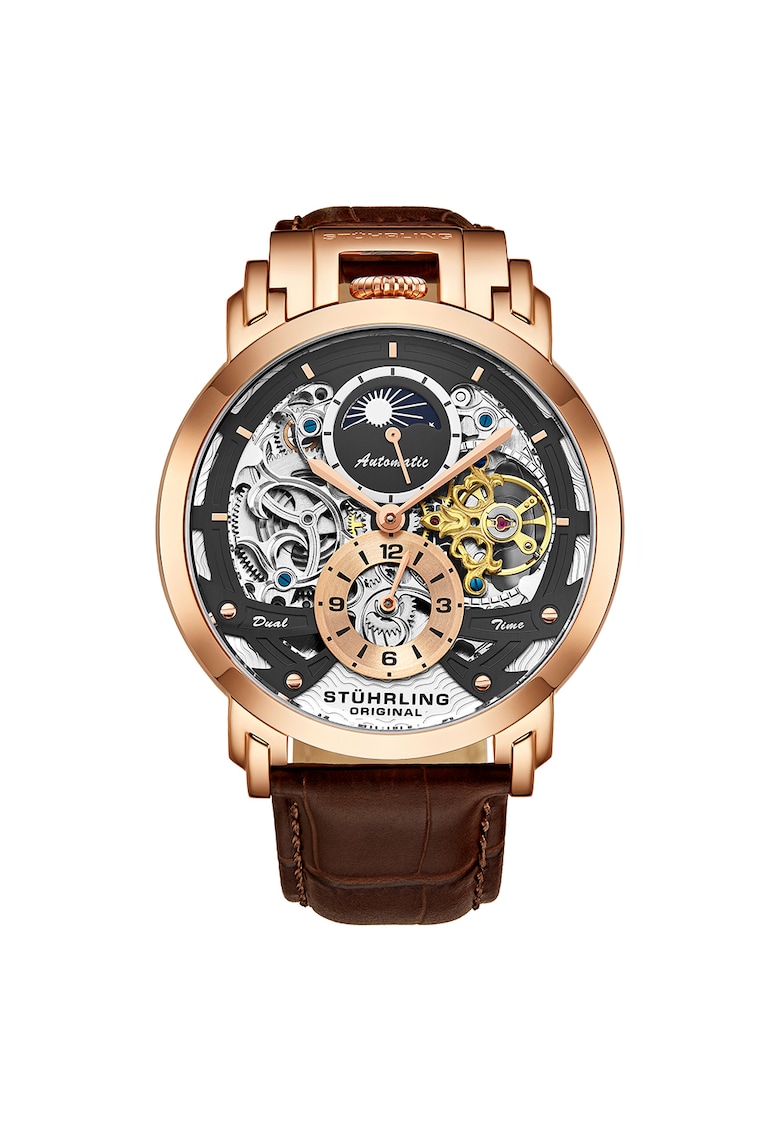 - cadran skeleton Cadran Material geam: cristal mineral Carcasa Forma carcasa: rotunda Material carcasa: inox Culoare carcasa: auriu rose Curea/bratara Tip: curea Material curea/bratara: piele naturala Culoare curea/bratara: maro Latime curea/bratara: 24 mm