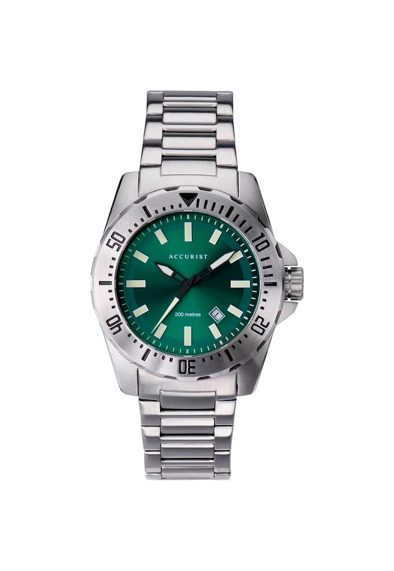 - afisare data Rezistenta la apa: 20 atm Cadran Material geam: cristal mineral Culoare cadran: verde Tip citire cadran: linii Carcasa Forma carcasa: rotunda Material carcasa: inox Culoare carcasa: argintiu Diametru carcasa: 43 mm Grosime carcasa: 14 mm Curea/bratara Material curea/bratara: inox Culoare curea/bratara: argintiu
