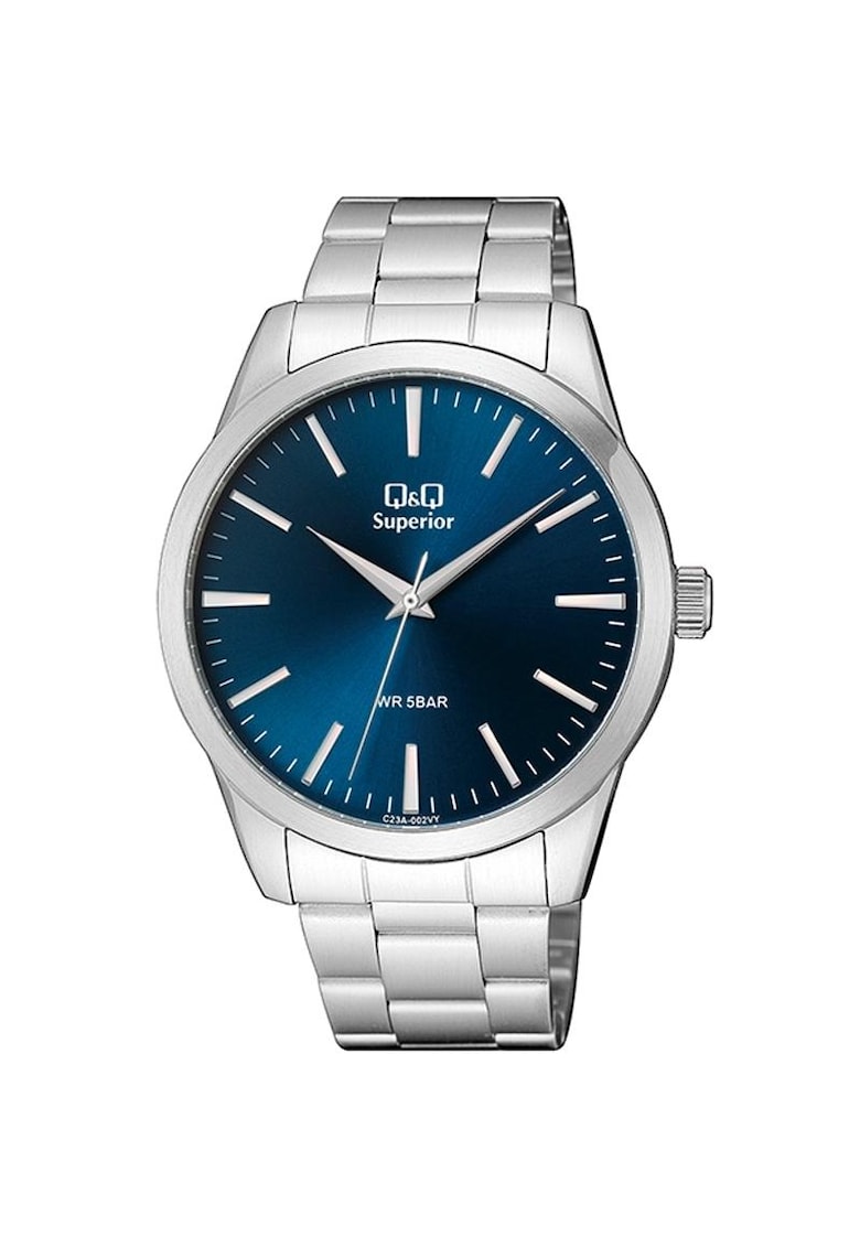 - secunda Rezistenta la apa: 5 atm Cadran Material geam: cristal mineral Culoare cadran: albastru Tip citire cadran: linii Carcasa Forma carcasa: rotunda Material carcasa: alama Culoare carcasa: argintiu Diametru carcasa: 44 mm Curea/bratara Tip: bratara Material curea/bratara: otel Culoare curea/bratara: argintiu Latime curea/bratara: 22 mm