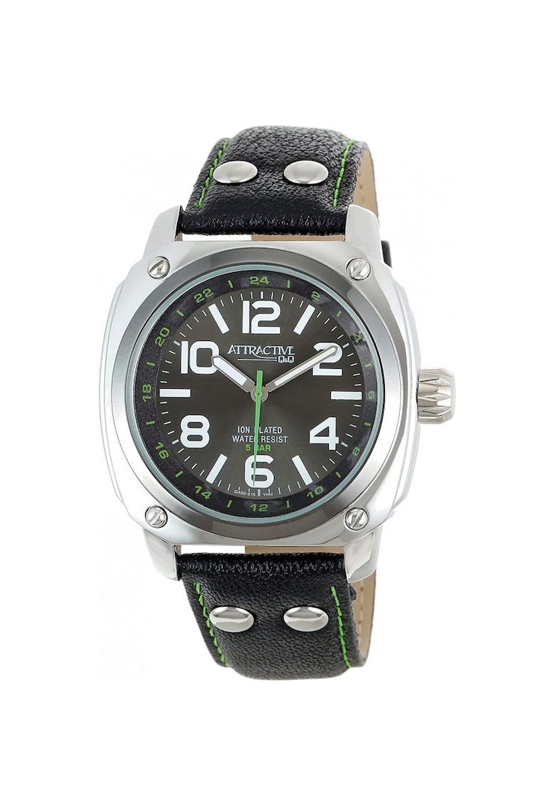 Caracteristici generale Tip mecanism: quartz Stil: casual Sistem inchidere: catarama Tip display: analog Functii: minut Rezistenta la apa: 5 atm Cadran Material geam: cristal mineral Culoare cadran: negru Tip citire cadran: cifre arabe Carcasa Forma carcasa: rotunda Material carcasa: aliaj Culoare carcasa: argintiu Diametru carcasa: 44 mm Curea/bratara Tip: bratara Material curea/bratara: piele ecologica Culoare curea/bratara: negru