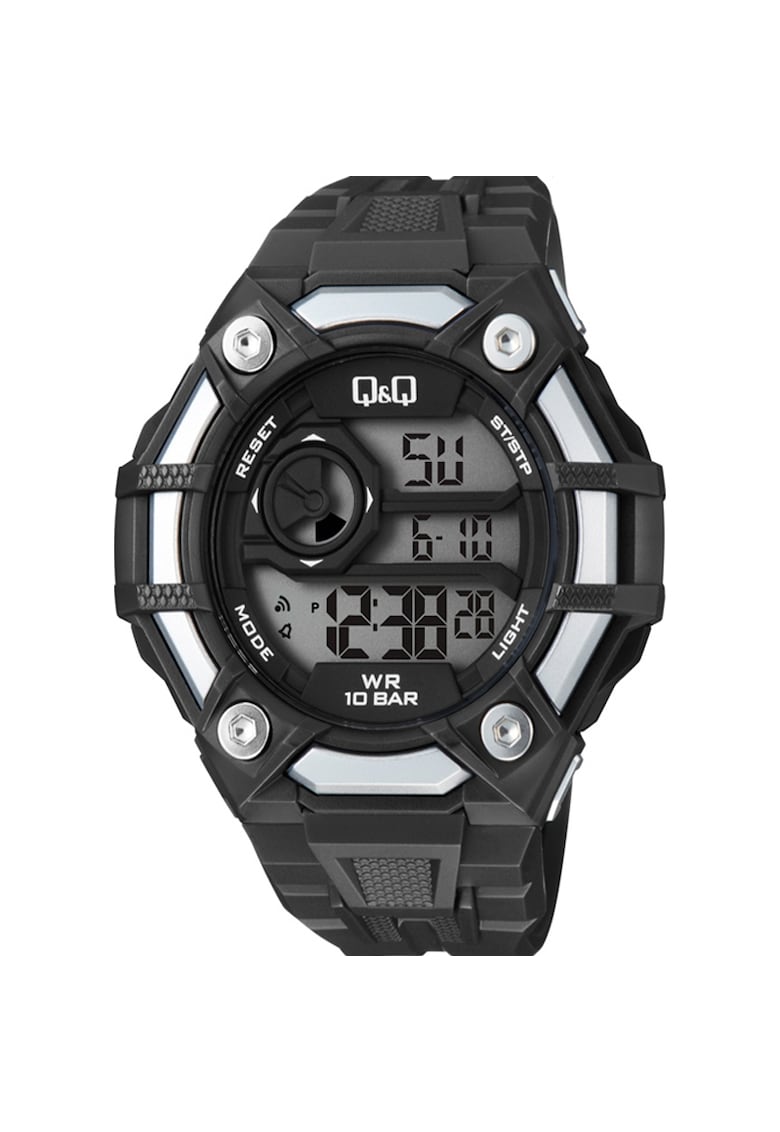Caracteristici generale Tip mecanism: quartz Stil: sport Tip display: digital Functii: cronometru Rezistenta la apa: 10 atm Greutate: 56 g Cadran Material geam: plastic Culoare cadran: gri Carcasa Material carcasa: plastic Culoare carcasa: negru Diametru carcasa: 52.5 mm Grosime carcasa: 16.2 mm Curea/bratara Tip: curea Material curea/bratara: silicon Culoare curea/bratara: negru