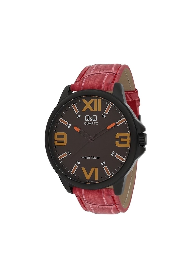 - secunda Rezistenta la apa: 3 atm Cadran Material geam: cristal mineral Culoare cadran: negru Tip citire cadran: cifre arabe Carcasa Forma carcasa: rotunda Material carcasa: alama Culoare carcasa: negru Diametru carcasa: 45 mm Curea/bratara Tip: bratara Material curea/bratara: piele naturala Culoare curea/bratara: rosu