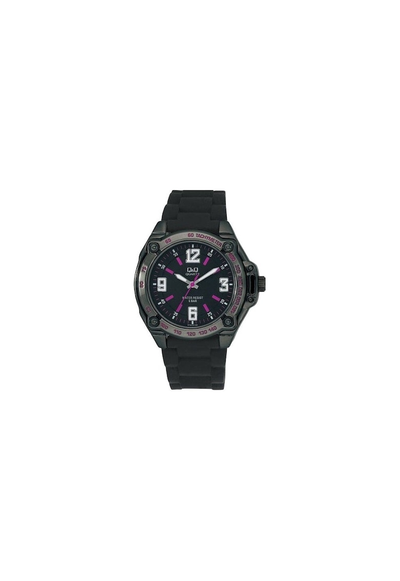 - tahimetru Rezistenta la apa: 5 atm Cadran Material geam: cristal mineral Culoare cadran: negru Tip citire cadran: cifre arabe Carcasa Forma carcasa: rotunda Material carcasa: alama Culoare carcasa: negru Diametru carcasa: 52 mm Curea/bratara Tip: bratara Material curea/bratara: silicon Culoare curea/bratara: negru