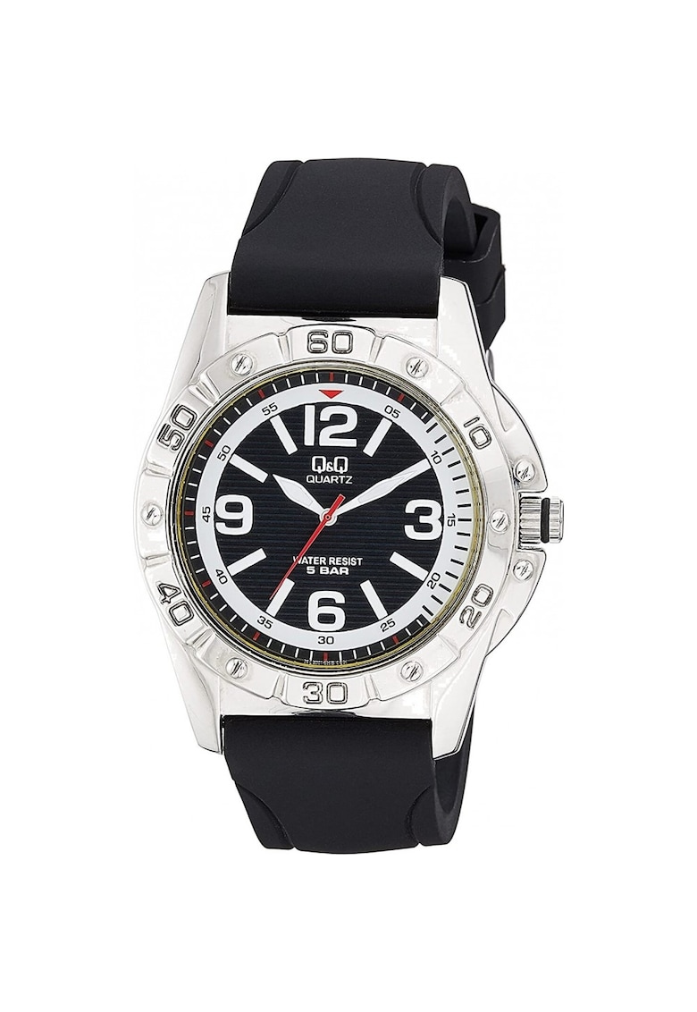 - secunda Rezistenta la apa: 5 atm Cadran Material geam: cristal mineral Culoare cadran: negru Tip citire cadran: cifre arabe Carcasa Forma carcasa: rotunda Material carcasa: alama Culoare carcasa: argintiu Diametru carcasa: 46 mm Curea/bratara Tip: bratara Material curea/bratara: silicon Culoare curea/bratara: negru