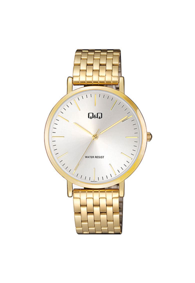 - secunda Rezistenta la apa: 3 atm Cadran Culoare cadran: argintiu Culoare indici: auriu Tip citire cadran: linii Carcasa Forma carcasa: rotunda Culoare carcasa: auriu Curea/bratara Tip: bratara Material curea/bratara: metal Culoare curea/bratara: auriu Finisaj curea/bratara: lucios